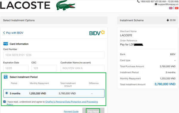 Select the “Installment by credit card” payment method to start the installment purchase process. Applicable for order with a total value of 3.000.000 VND or more.